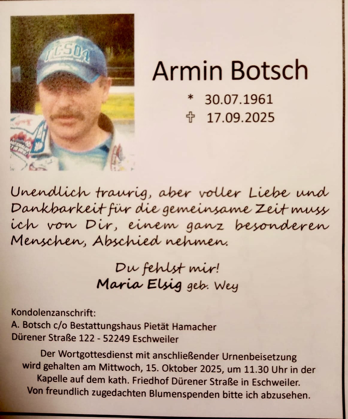 hier die Traueranzeige von Maria für Armin! Bestattung in Eschweiler, DürenerStrasse, am 15.10.2025 um 11:30 Uhr !