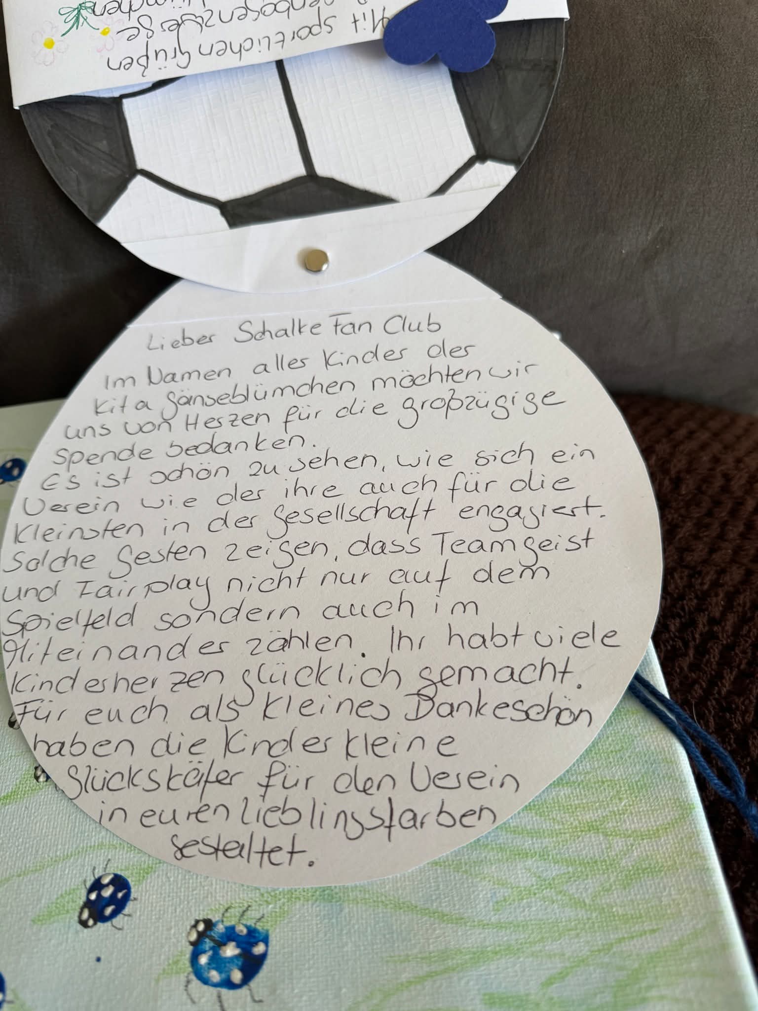 Es kam große Freude auf. Die Kinder haben für uns ein Bild mit vielen Blau-Weißen Maikäfern gemacht auf denen viele Weiße Punkte waren........vielleicht etwas "Seitenhieb"